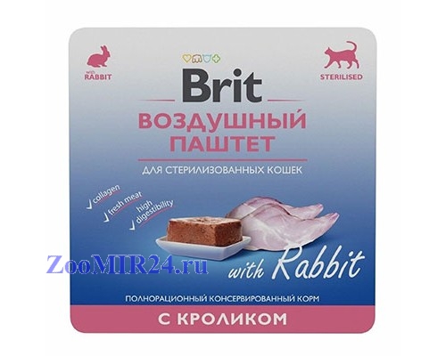 Корм Brit Sterilised Rabbit (паштет) для стерилизованных кошек, с кроликом. Технология производства воздушных паштетов аэрация. Аэрация - это насыщение воздухом. Воздушные паштеты высокотехнологичный продукт, который производится в специальном аппарате паштетном эмульситаторе. Сырье одновременно измельчается, смешивается и взбивается, приобретая легкую, воздушную консистенцию. Не менее 74% в мяса в составе. Высокая поедаемость у кошек. Не содержит искусственных ароматизаторов и консервантов. Содержит витамины и минералы для крепкого иммунитета. Сбалансирование содержание незаменимых аминокислот. Полноценный состав по жирорастворимым витаминам, необходимым организму для здоровья. Содержит цикорий источник клетчатки и пребиотика инулина. Содержит юкку, в которой содержатся фенолы и сапонины, которые способствуют снижению различных воспалений, помогают работе печени, стимулируют пищеварение. Благотворно влияют эти вещества и на иммунитет, укрепляя весь организм. Имеет идеальную консистенцию. Упаковано в ламистер алюминиевую упаковку нового поколения, что означает герметичность, безопасность и легкость открывания, легкий вес.